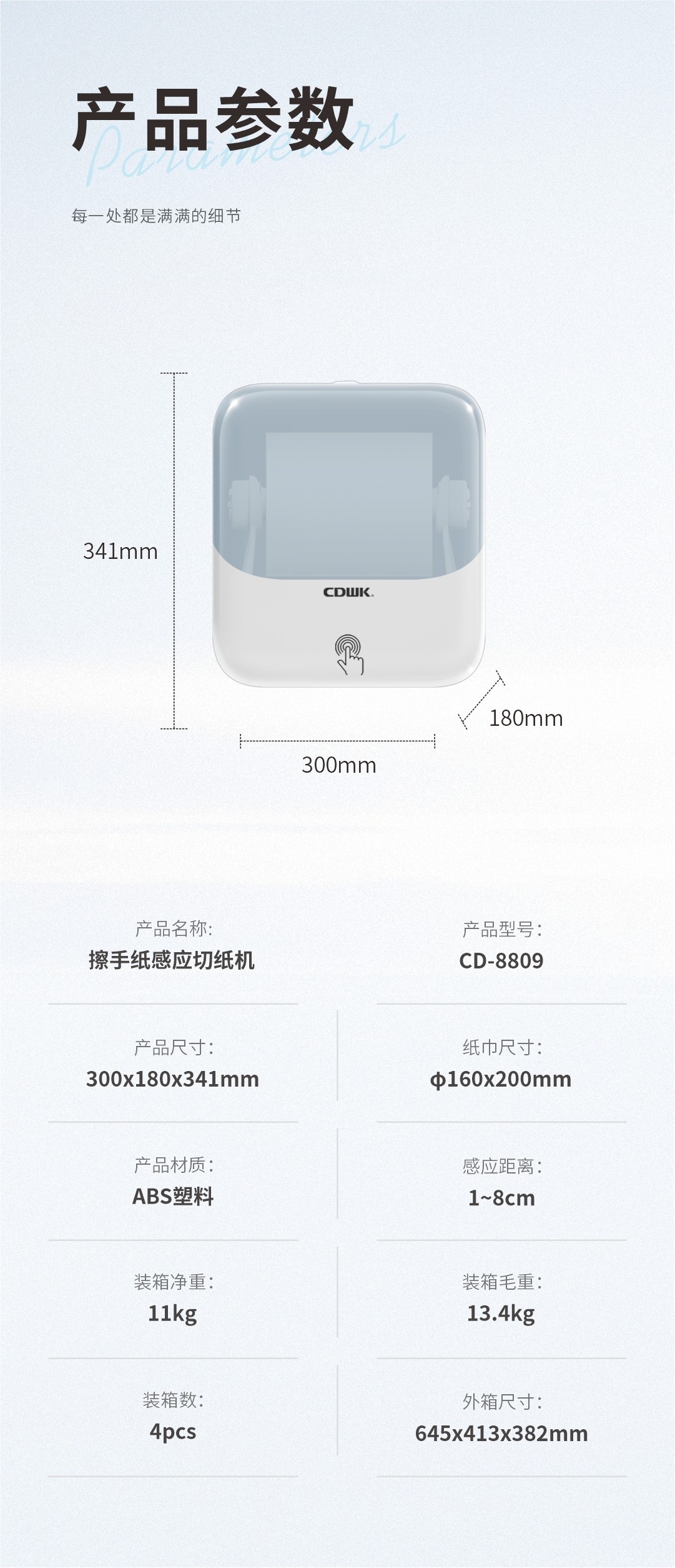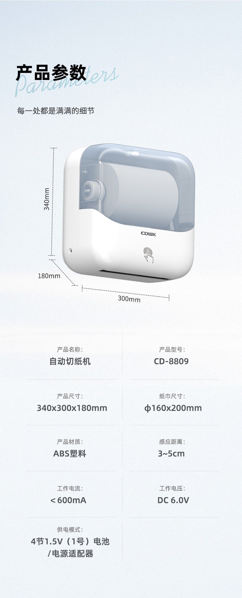 纸巾尺寸:Φ160 × 200 mm